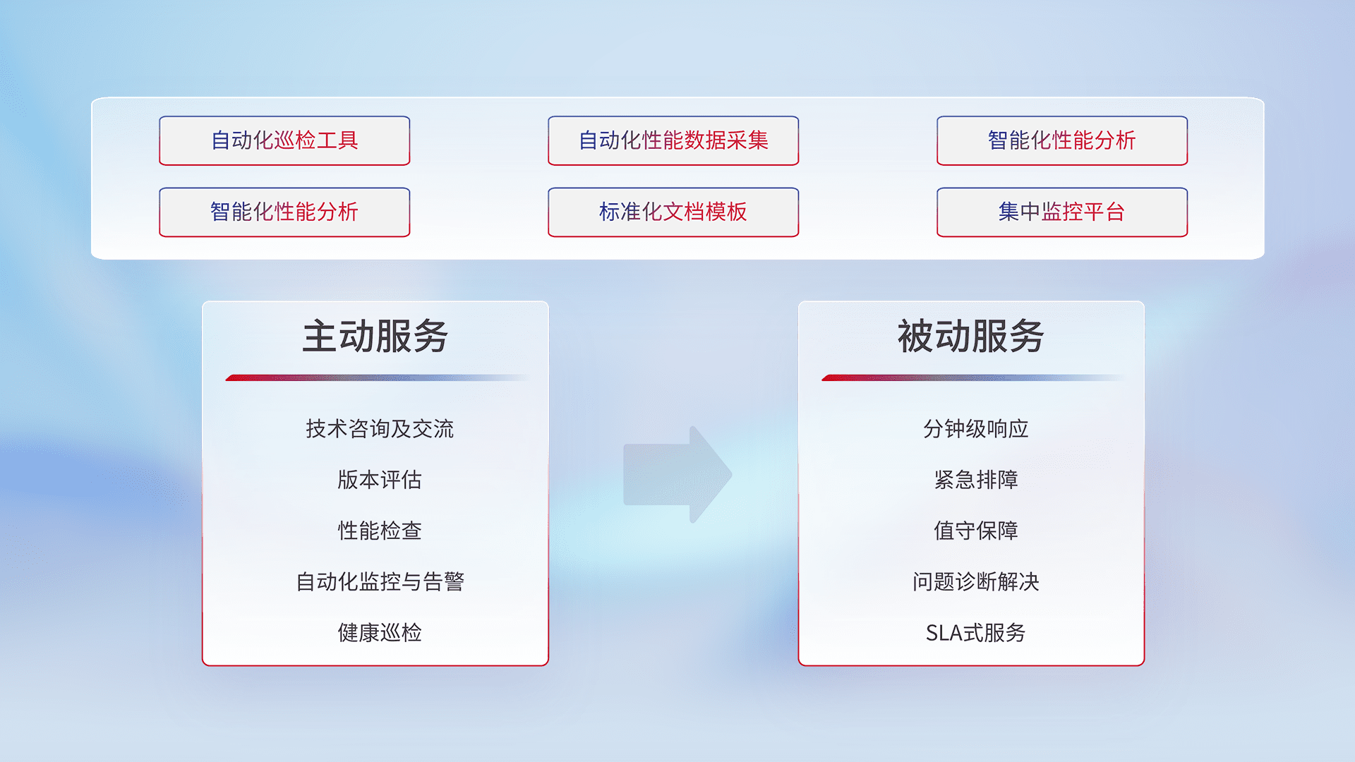 智能化工具和标准化文档,,保障服务质量,,,提供主动服务(包含技术咨询、、、、版本评估、、性能检查、、、自动化监控与告警、、健康巡检)和被动服务包含(分钟级响应、、、紧急排障、、、、值守保障、、、问题诊断解决、、、SLA服务)。。。。